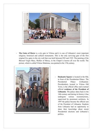 The BET project participants visited several important cultural sites in and around Vilnius, Lithuania. At Europos Parkas, an outdoor art museum, students viewed sculptures by famous artists and enjoyed the natural scenery. In Vilnius, the group explored the historic Old Town and important landmarks like the Gates of Dawn chapel and St. Anne's Church. They also visited Trakai Castle, located on an island in a lake, before returning to Druskininkai. Students documented their experiences through photos and presentations.