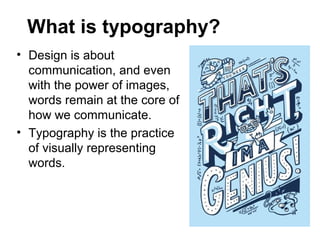 This document discusses typography and type design principles. It covers what typography is, how type conveys meaning through attributes like size, weight, and color, and how first impressions are important. Different typefaces have different characters that contribute to the message. The anatomy of a letter and classifications of typefaces like serif, sans-serif, slab-serif, and more are explained. Terms like letterspacing, line height, line length, and x-height are defined. The document concludes with discussions on legibility of type on screens and an assignment involving analyzing logo design principles.