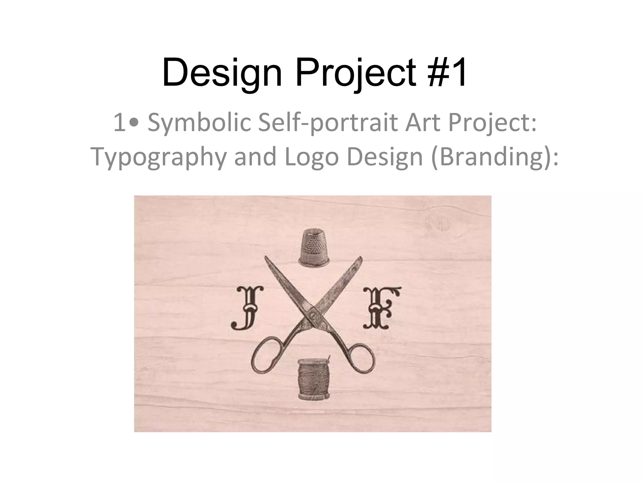 This document outlines a design project assignment to create a symbolic self-portrait logo. Students are asked to design a logo incorporating text and/or symbols that represent some aspect of themselves, their life, opinions, or field of study. The logo should be visually exciting and convey a sense of who they are. Over two weeks, students will brainstorm ideas, choose a typeface, trace their design, and plan the composition before using a large-scale printer to create their final logo design. Typography, images, and graphic elements are highlighted as key components of graphic design. Examples of logos and designers like Neville Brody and Frank Chimero are provided for inspiration.