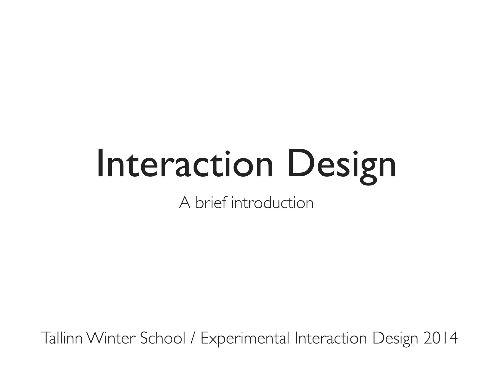 The document outlines the themes and approaches of a workshop on interaction design at the Tallinn Winter School in 2014, emphasizing user experience (UX) needs, goals, and abilities throughout the design process. It introduces various interaction design concepts such as usability, product development, and user-centered design methodologies. Participants are encouraged to generate ideas and define problems to explore in their projects.