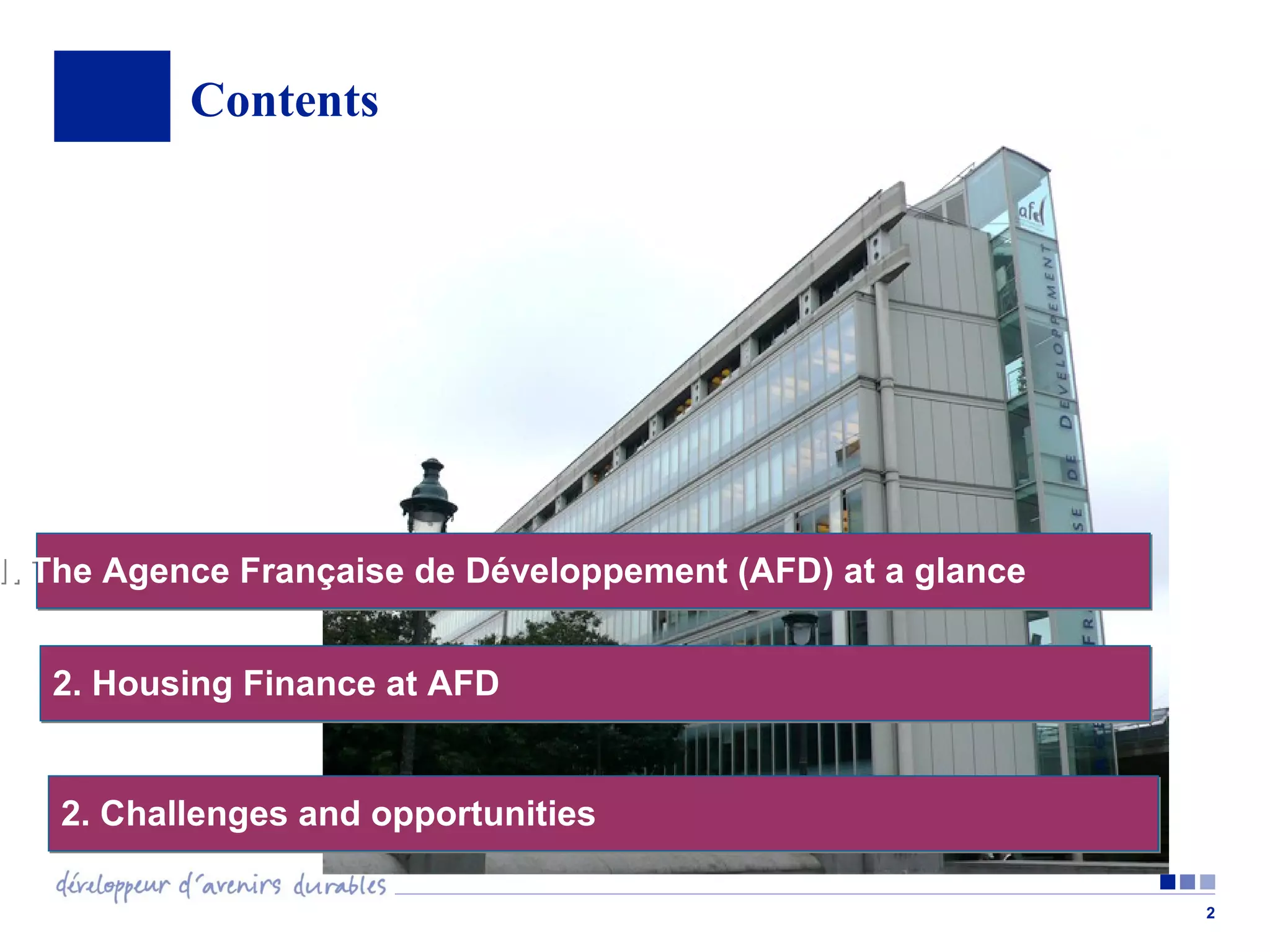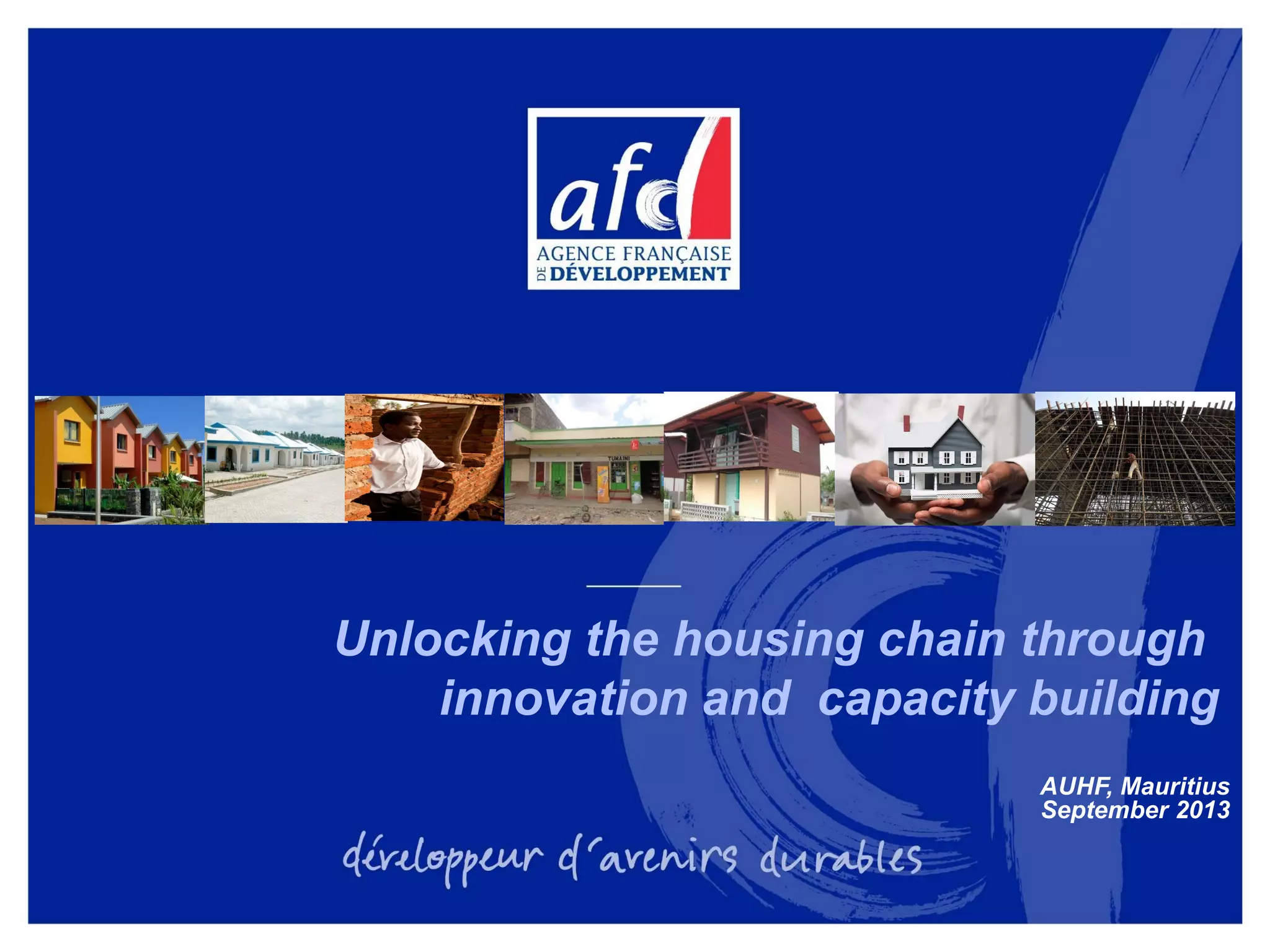 The document outlines the role of Agence Française de Développement (AFD) in providing housing finance and promoting sustainable urban development in Africa, particularly focusing on supporting middle to low-income households. It highlights AFD's various partnerships, financing tools, and challenges faced in the housing sector, such as ineffective public policy and poor private investment cooperation. The document concludes with recommendations for improving housing finance through collaboration and innovative solutions.