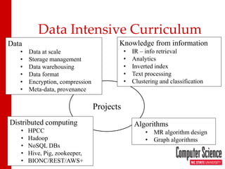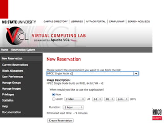 The document discusses leveraging HPCC systems within a Virtual Computing Lab (VCL) at North Carolina State University, focusing on data-intensive projects, distributed computing, and the creation of a standalone HPCC image for educational purposes. It outlines the laboratory's history, operational stats, configuration issues, and the potential for teaching various computing concepts using HPCC. Additionally, it touches upon research extending ECL with natural language processing and the transition to elastic HPCC systems for more efficient resource management.