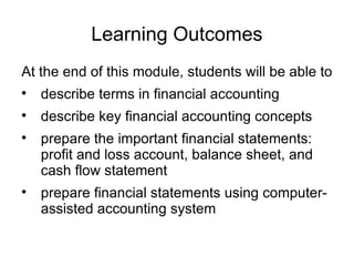 This document provides an introduction to accounting, outlining key learning outcomes around financial accounting concepts and statements. It describes the accounting process, different types of businesses and their structures, the roles of accountants, and important accounting regulations and standards. Students will learn to prepare financial statements and use accounting software to analyze business transactions and communicate financial information.