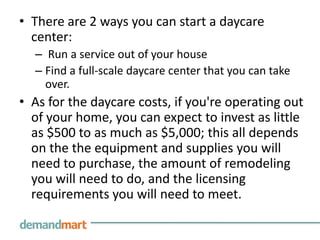 This document discusses the costs of starting a daycare center. Running a home daycare can cost $500-$5,000 depending on equipment needed, remodeling, and licensing. A separate facility can cost up to $100,000. Important expenses include certifications, safety equipment, furniture, supplies, advertising, and insurance. States have licensing and training requirements that affect costs, such as child ratios, meals, and safety courses. The document advises setting enrollment goals and checking state regulations to understand costs. Many centers need 150-200 children to earn $100,000 after taxes due to high operational costs.