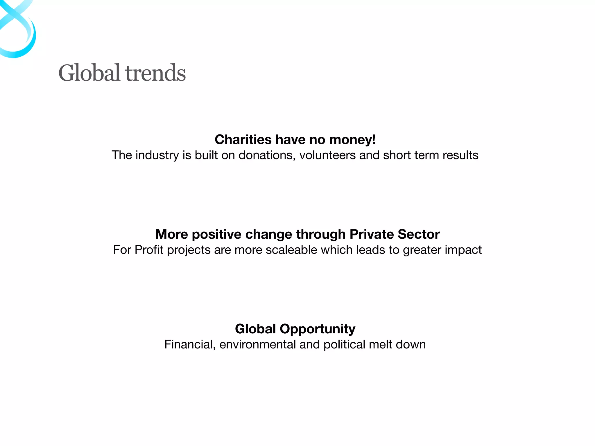 Global trends show that charities are struggling due to lack of donations and volunteers, while short-term results focus. For-profit social enterprises are seen as more scalable and able to create greater impact. A growing opportunity exists amidst financial, environmental and political crises for social enterprises that engage youth through meaningful projects and career opportunities in a socially-minded workplace.