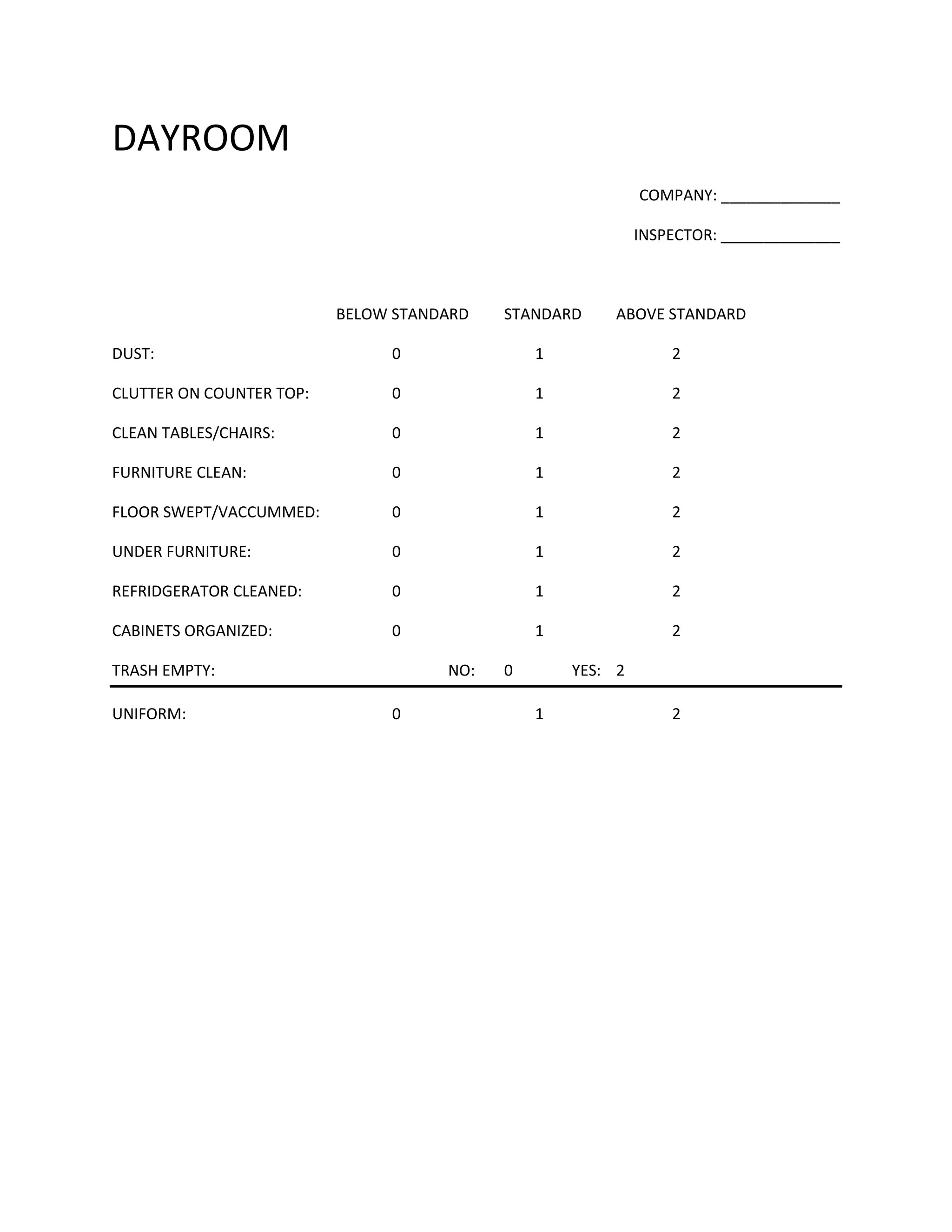 DAYROOMCOMPANY: ______________INSPECTOR: ______________BELOWSTANDARDSTANDARDABOVE STANDARDDUST:0 12CLUTTER ON COUNTER TOP:0 12CLEAN TABLES/CHAIRS:0 12FURNITURE CLEAN:0 12FLOOR SWEPT/VACCUMMED:0 12UNDER FURNITURE:0 12REFRIDGERATOR CLEANED:0 12CABINETS ORGANIZED:0 12TRASH EMPTY:NO: 0 YES:2UNIFORM:0 12