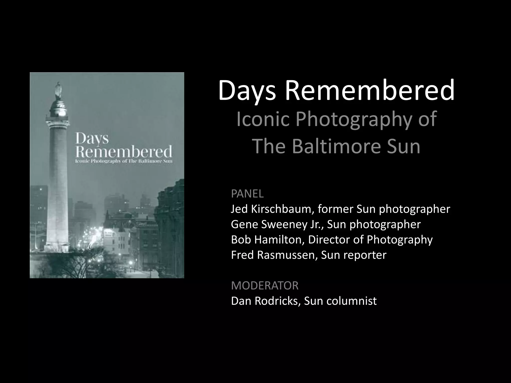 The panel discussion featured four individuals associated with The Baltimore Sun - two photographers, a director of photography, and a reporter - discussing iconic photographs from the newspaper's history. The photographers shared stories from their careers capturing memorable images for The Sun. The director of photography and reporter provided historical context for the impact of photographs published in the newspaper.