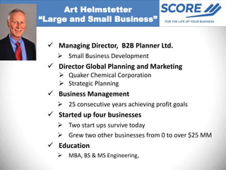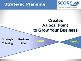 The document outlines a small business strategy development process. It begins with understanding the current situation, analyzing internal and external factors, deciding on a strategy, and taking action. A SWOT analysis and consideration of goals, objectives, strategies, and action items are key parts of the planning process. Regular monitoring and updates are needed as strategies can fail due to a lack of focus, inaccurate information, or not adapting to changes.