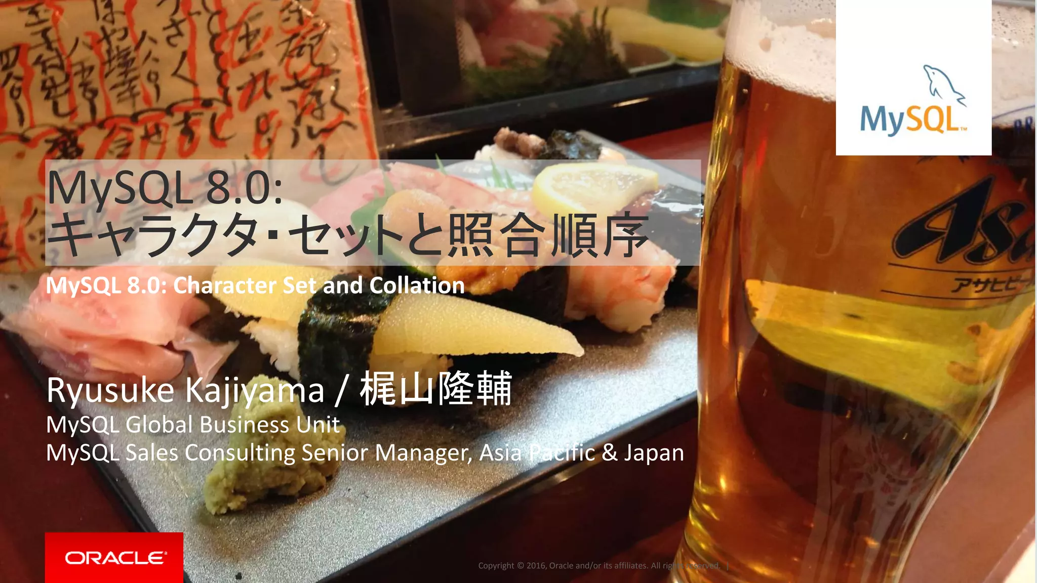 Oracle and/or its affiliates. All rights reserved. | MySQL 8.0: キャラクタ・セットと照合順序 MySQL 8.0: Character Set and Collation Ryusuke Kajiyama / 梶山隆輔 MySQL Global Business Unit MySQL Sales Consulting Senior Manager, Asia Pacific & Japan