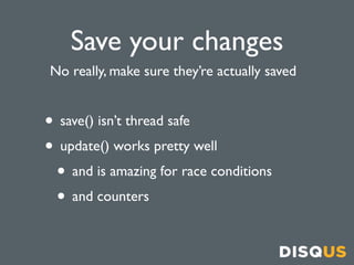 The document provides tips for optimizing Django applications. It recommends using update() instead of save() for thread safety, partitioning queries to avoid expensive joins that don't scale, caching querysets judiciously, and delaying creation of model instances until needed to reduce memory usage and improve performance. The author concludes by advertising open engineering positions at their company.