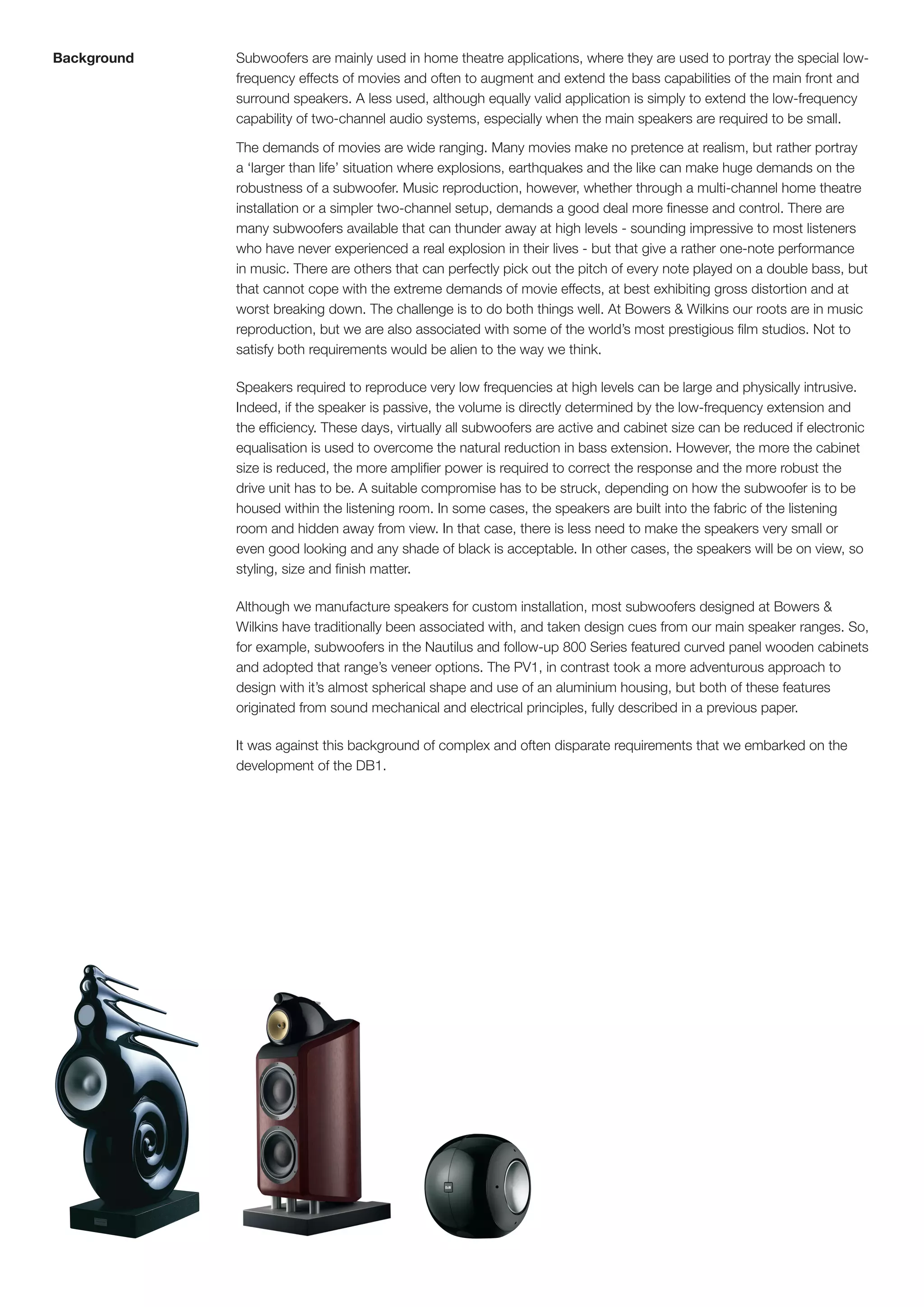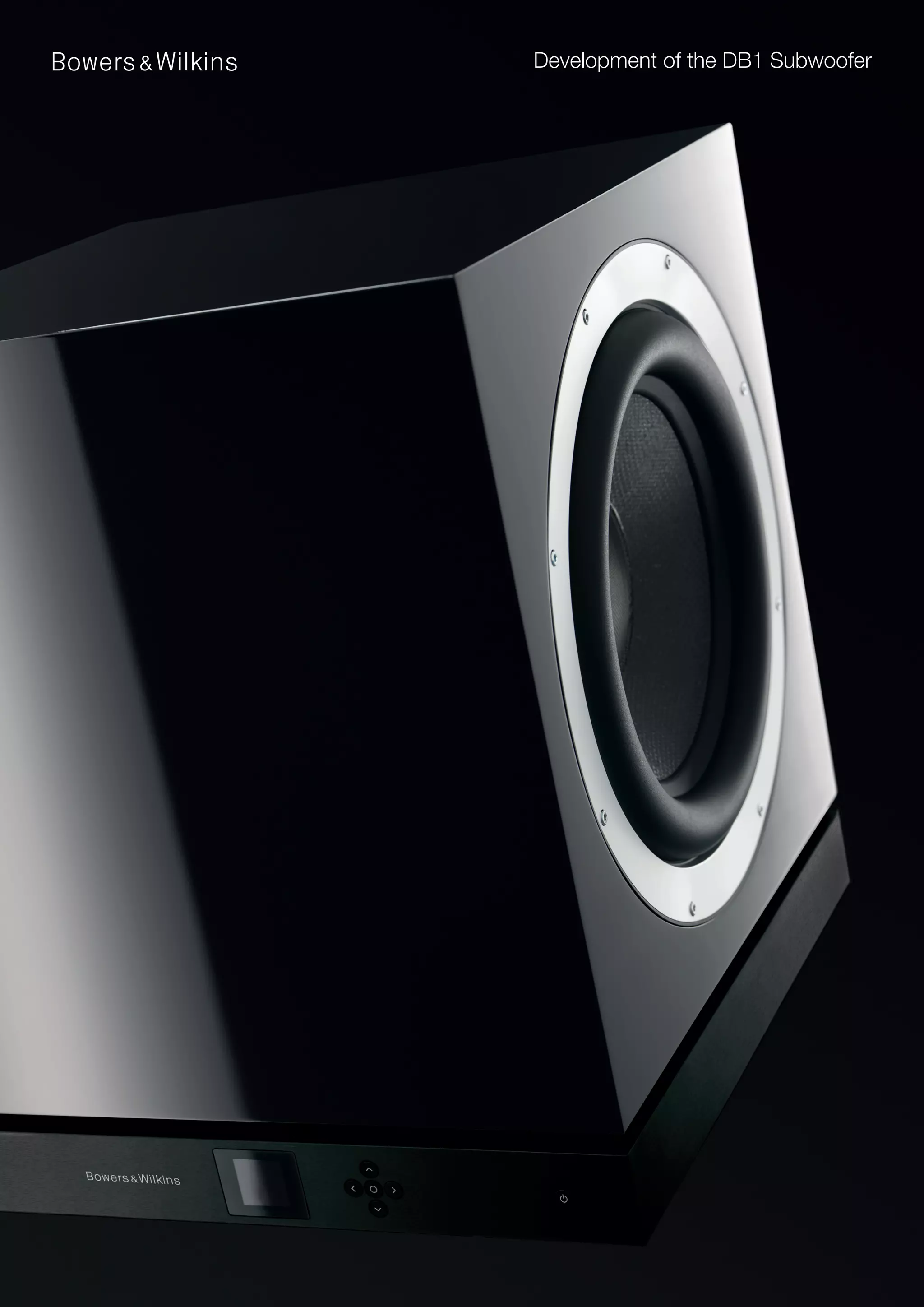 The document describes the development of the DB1 subwoofer by Bowers & Wilkins. Key points include: