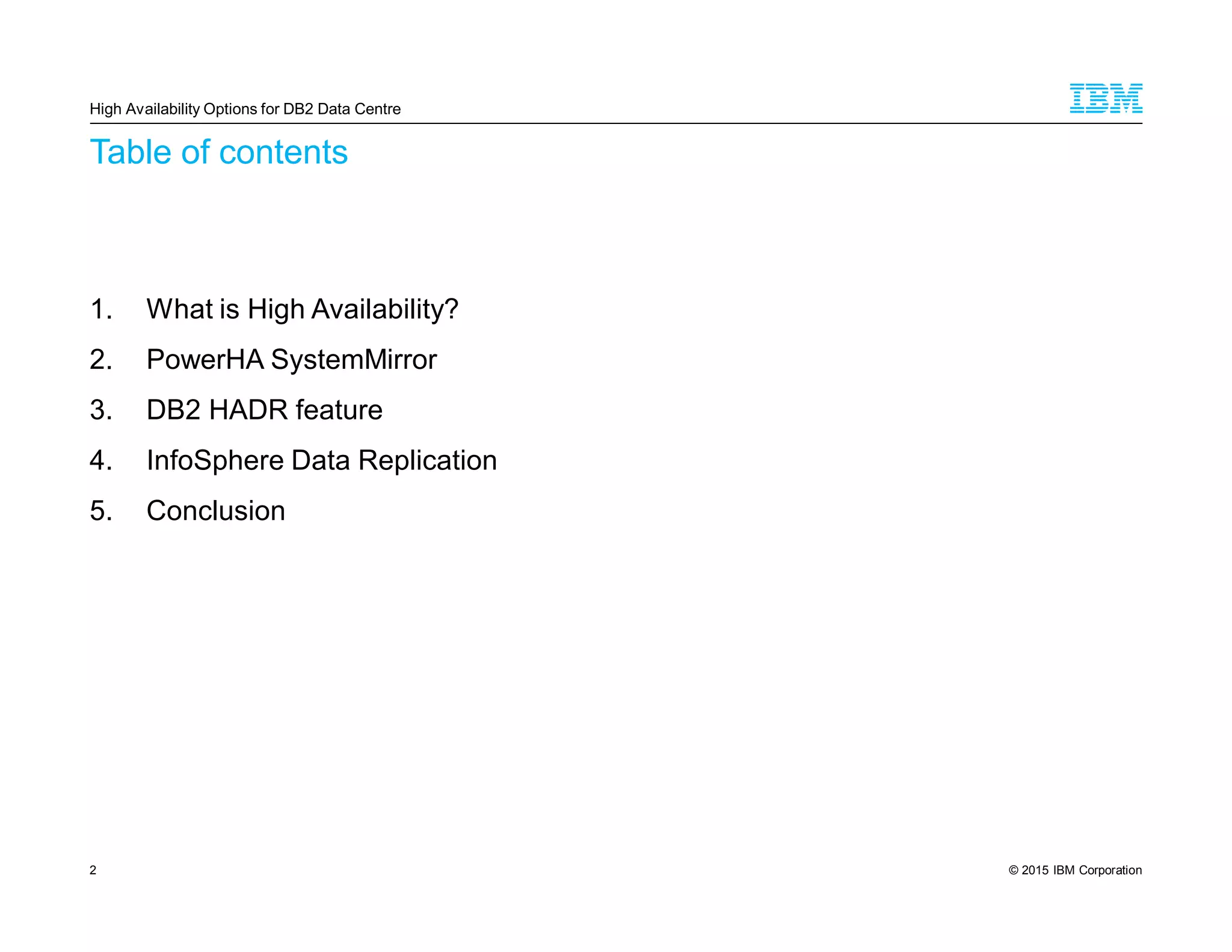 This document discusses high availability options for DB2 data centers, including PowerHA SystemMirror, DB2 HADR, and InfoSphere Data Replication. PowerHA provides failover clustering through separate hardware and shared storage. DB2 HADR uses log shipping for continuous backup and fast takeover. InfoSphere replicates transactions to remote sites for no single point of failure. While each option has advantages, combining methods provides better risk coverage, though too much complexity can introduce failures. Thorough testing is important.