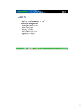 This document focuses on achieving query access plan stability in IBM DB2 databases, discussing the impact of SQL statement writing, database configuration, catalog statistics, and optimization techniques. It emphasizes the importance of consistent performance metrics through proper query structure and regular data statistics updates to avoid unexpected access plan changes. Additionally, it outlines best practices for SQL writing and offers insights on using tools like the explain facility for diagnosing access plan issues.