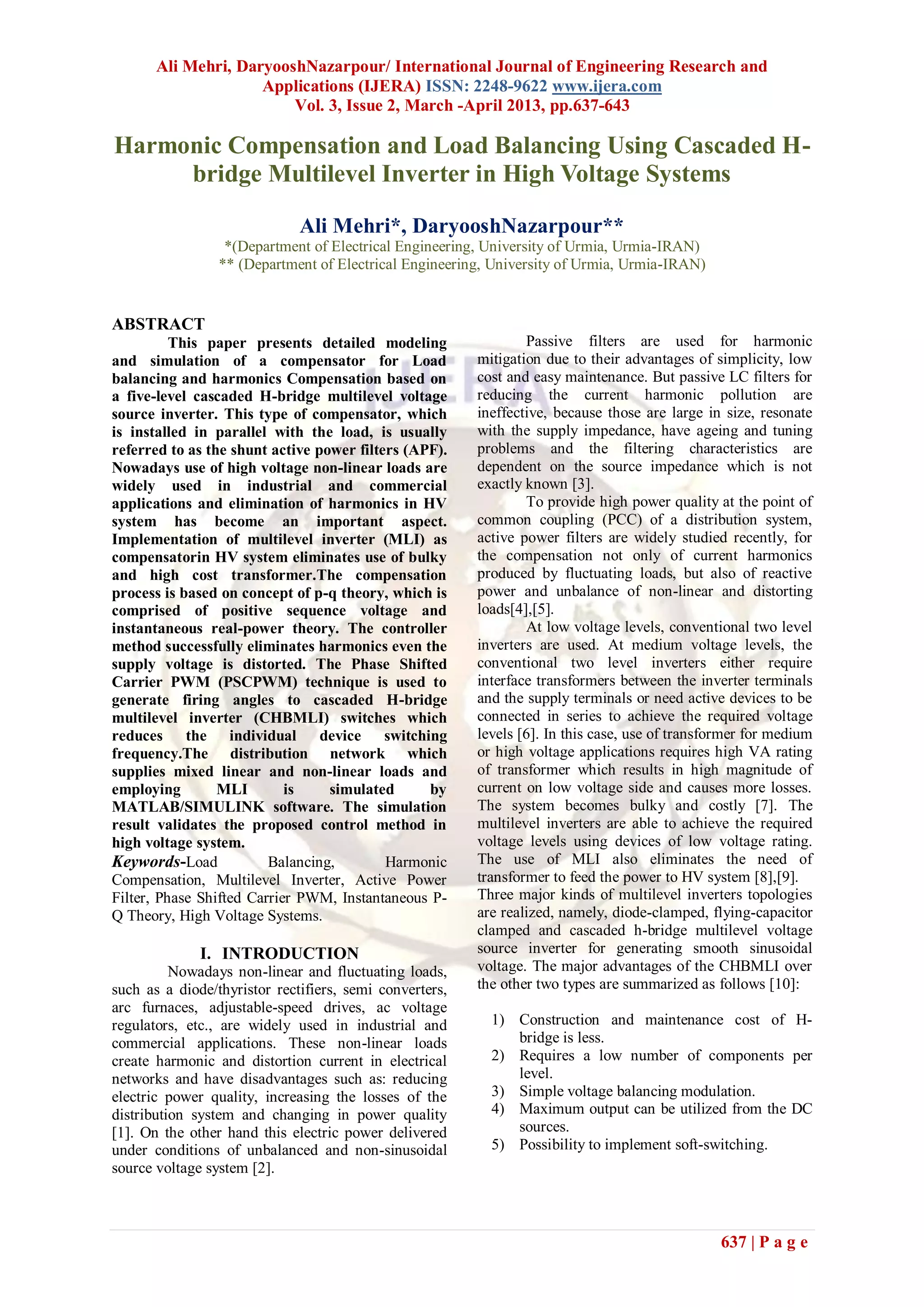 The document discusses a method for harmonic compensation and load balancing using a cascaded H-bridge multilevel inverter in high voltage systems. It emphasizes the advantages of the multilevel inverter over traditional methods, including reduced size and cost, and provides a simulation-based validation of the proposed control technique. The paper details the operation, modulation strategies, and control algorithms based on p-q theory to enhance power quality in distribution systems affected by non-linear loads.