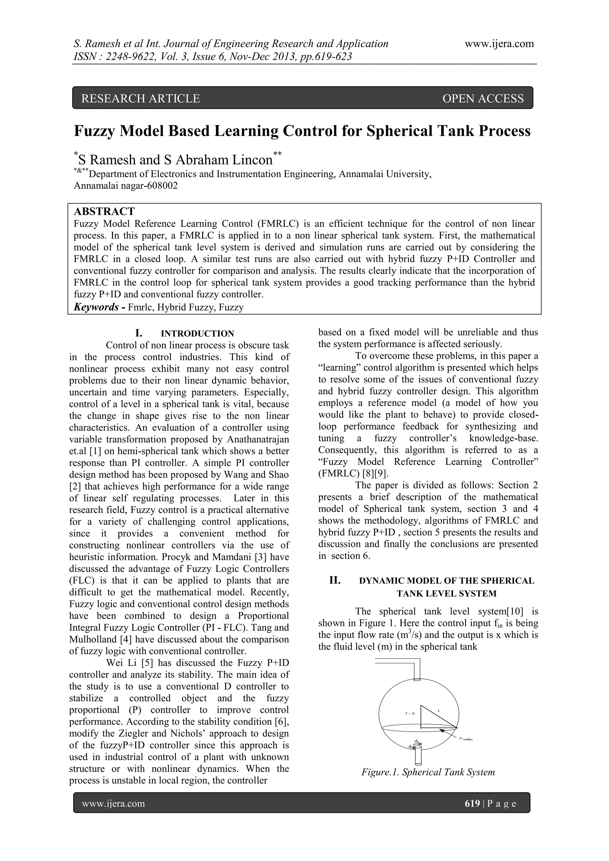 The document discusses the implementation of a fuzzy model reference learning control (FM RLC) for a non-linear spherical tank system, showing how this method outperforms conventional and hybrid fuzzy controllers. It details the design process, mathematical modeling, and performance outcomes of using FM RLC in controlling the fluid level in the tank. Comparative simulations demonstrate that FM RLC achieves superior tracking and stability in various operating conditions.