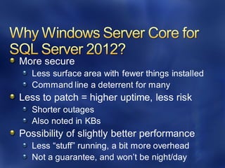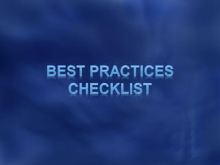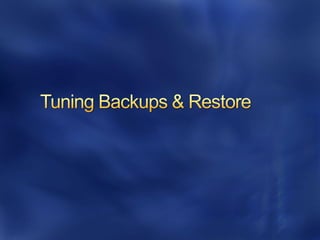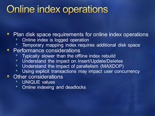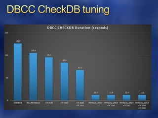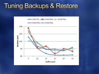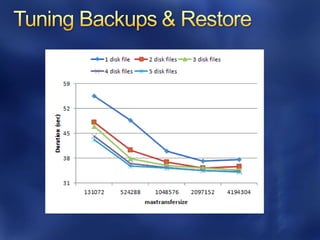 This document discusses best practices for optimizing SQL Server performance. It recommends establishing a baseline, identifying bottlenecks, making one change at a time and measuring the impact. It also provides examples of metrics, tools and techniques to monitor performance at the system, database and query levels. These include Windows Performance Monitor, SQL Server Activity Monitor, Dynamic Management Views and trace flags.