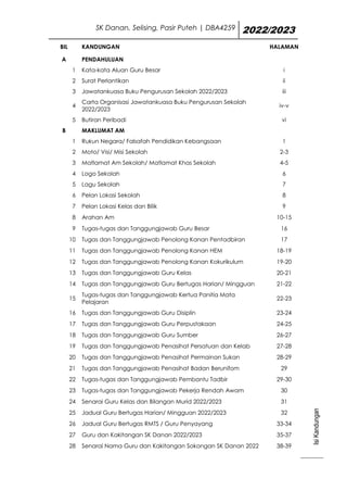 Dokumen ini adalah buku pengurusan untuk Sekolah Kebangsaan Danan bagi sesi 2022/2023 yang merangkumi maklumat pentadbiran, tugas guru, dan struktur organisasi. Ia bertujuan sebagai panduan untuk guru dalam melaksanakan tanggungjawab masing-masing bagi mencapai kecemerlangan sekolah. Selain itu, dokumen ini juga mencakupi maklumat mengenai visi, misi, dan matlamat khas sekolah.