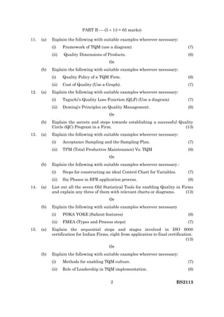 This document contains an examination for a Quality Management degree from August/September 2017. It includes multiple choice and written response questions covering various quality management topics like Total Quality Management (TQM) frameworks, quality dimensions, quality policies, cost of quality, Taguchi's Quality Loss Function, Deming's quality principles, quality circles, acceptance sampling, statistical process control, Lean tools like poka-yoke, Failure Mode and Effects Analysis (FMEA), ISO 9000 certification, and the House of Quality (HOQ) tool. The last question asks students to design an HOQ report for an electric car company or submit a quality circle program action plan for a computer manufacturer.