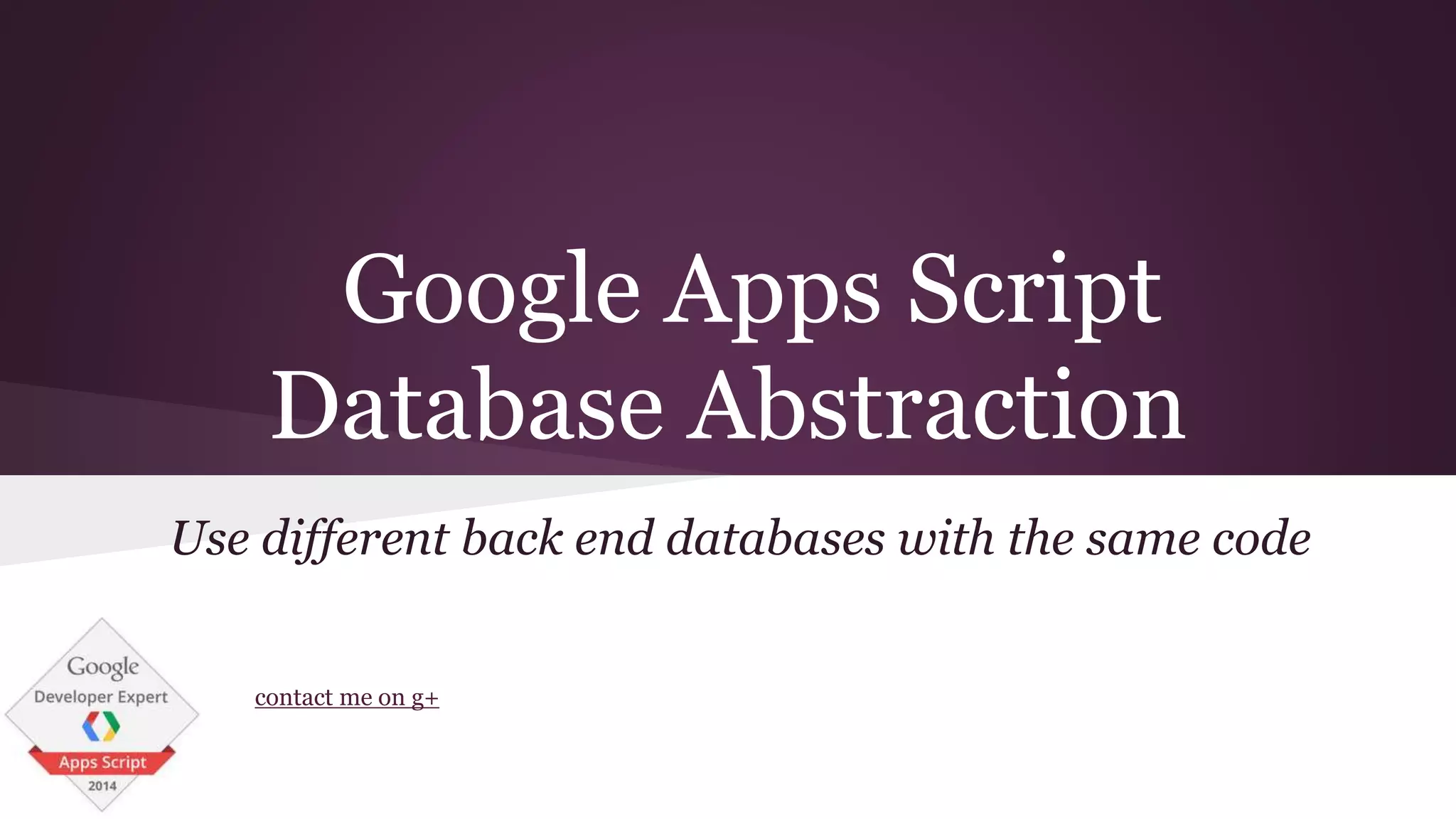 This document describes a database abstraction library for Google Apps Script that allows using different backend databases like Google Sheets, Drive files, and noSQL databases with the same code. It provides caching and handles common queries and operations with only 6 simple methods. Different backends can be accessed by getting a handle to the specific backend using the DataHandler class. Data can also be copied between backends and backends are accessible via a REST API.