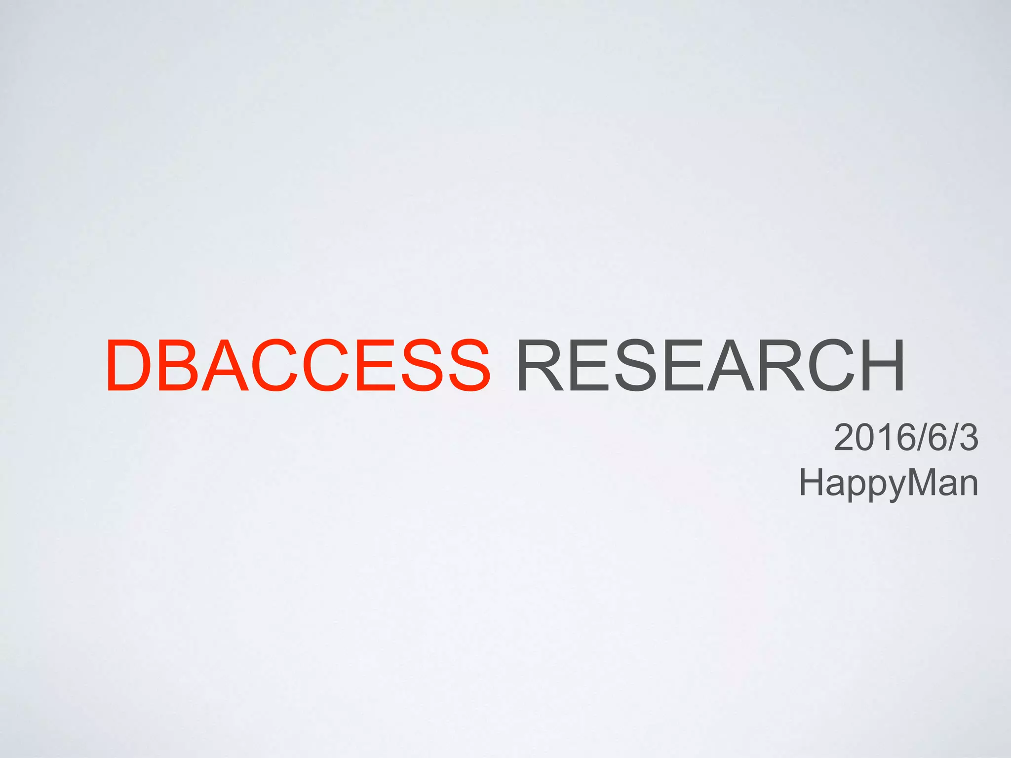 The document discusses DBAccess, an iOS ORM (object-relational mapper) that provides an alternative to CoreData. It highlights features like automatic modeling from class structures, a fluent query interface, an event model for tracking database changes, and support for managed and unmanaged objects. The document also provides code examples for setting up a project with DBAccess, creating data objects and properties, performing queries and handling results, and using the event model.