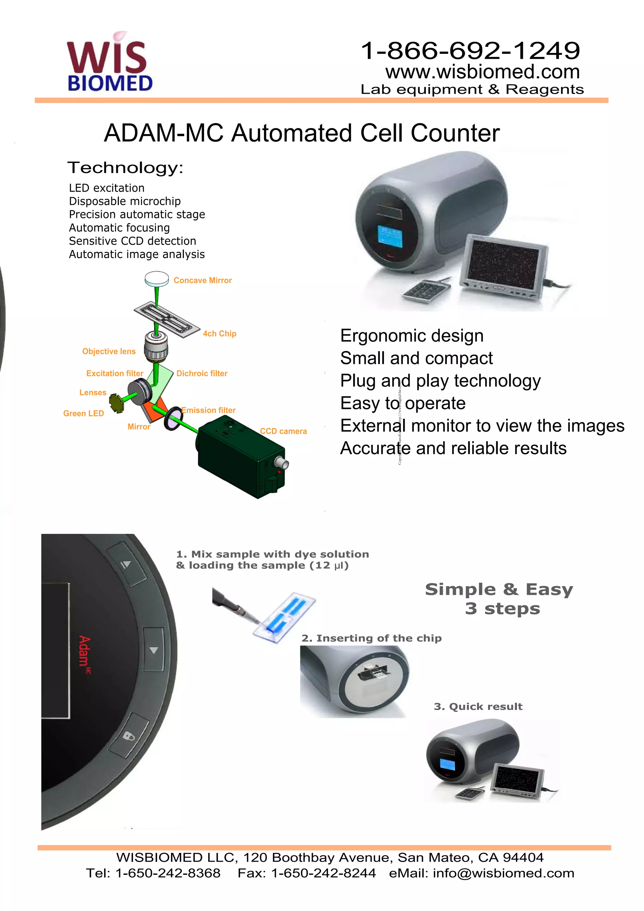 The ADAM-MC is an automated cell counter that uses LED excitation, a disposable microchip, and sensitive CCD detection to automatically focus, analyze images, and provide accurate and reliable cell counts. It has an ergonomic, compact design that allows for plug-and-play operation and viewing of images on an external monitor, and involves mixing samples with dye, inserting the chip, and quickly obtaining results.