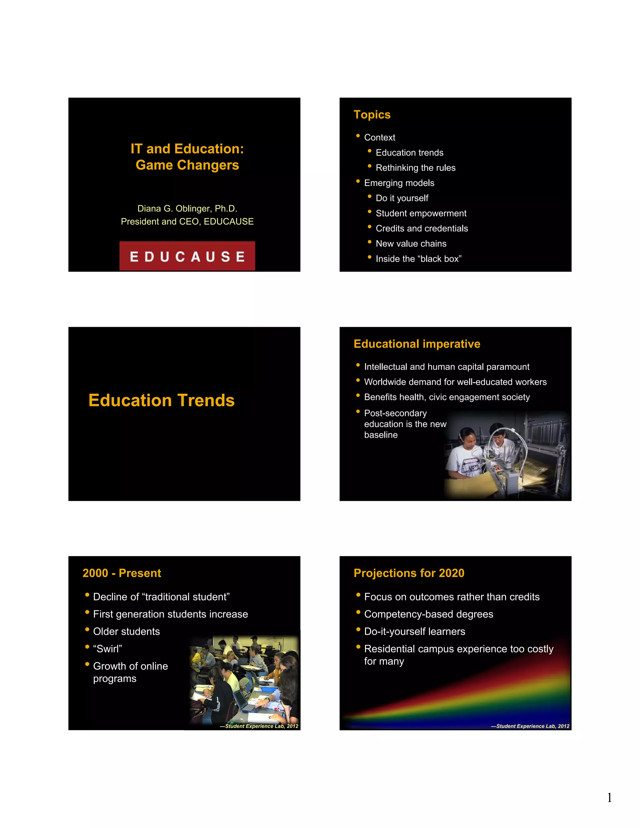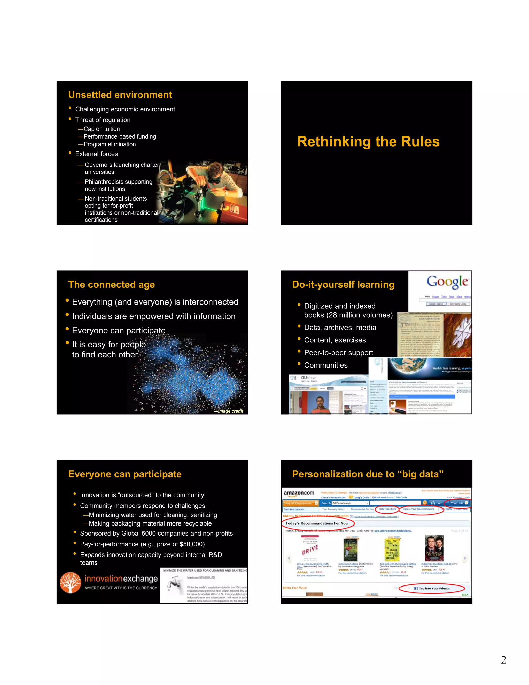This document discusses emerging trends in education that are being driven by new technologies and models. It covers topics such as the rise of online and self-directed learning through platforms like Khan Academy and MOOCs. Competency-based models and stackable credentials that decouple learning from traditional courses are also discussed. The use of data and analytics to personalize learning and improve student outcomes is highlighted. New partnerships and business models between educational institutions and other organizations are changing the traditional value chains in higher education.