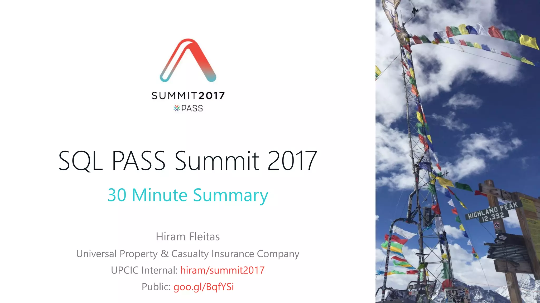 The document provides an extensive overview of the sessions, highlights, and keynotes from the SQL PASS Summit 2017, detailing various topics such as data modeling, performance tuning, and new features in SQL Server 2017. It includes insights from expert speakers, practical solutions regarding columnstore indexes, and best practices for database management. Additionally, the document emphasizes the importance of user participation and feedback throughout the conference.