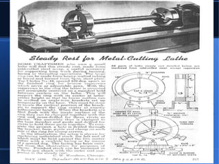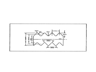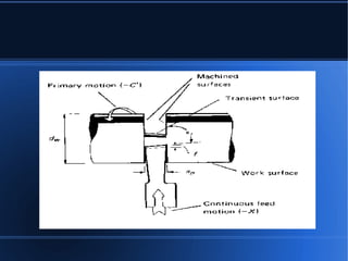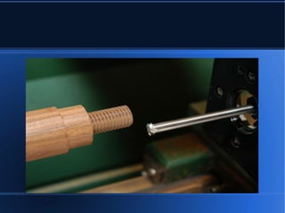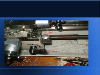 The document discusses threading on a lathe. It describes the basic requirements for thread cutting which are an accurately shaped threading tool and moving the tool longitudinally in relation to the workpiece rotation to determine the thread lead. It then provides a step-by-step process for cutting an external thread on a lathe, including preparing the workpiece, mounting the tool, setting the change gears to achieve the desired thread pitch, and engaging the half nut to start the threading cut. Lathes can be used to cut threads as they provide a versatile and simple method using the carriage and lead screw to relate the tool movement to workpiece rotation.