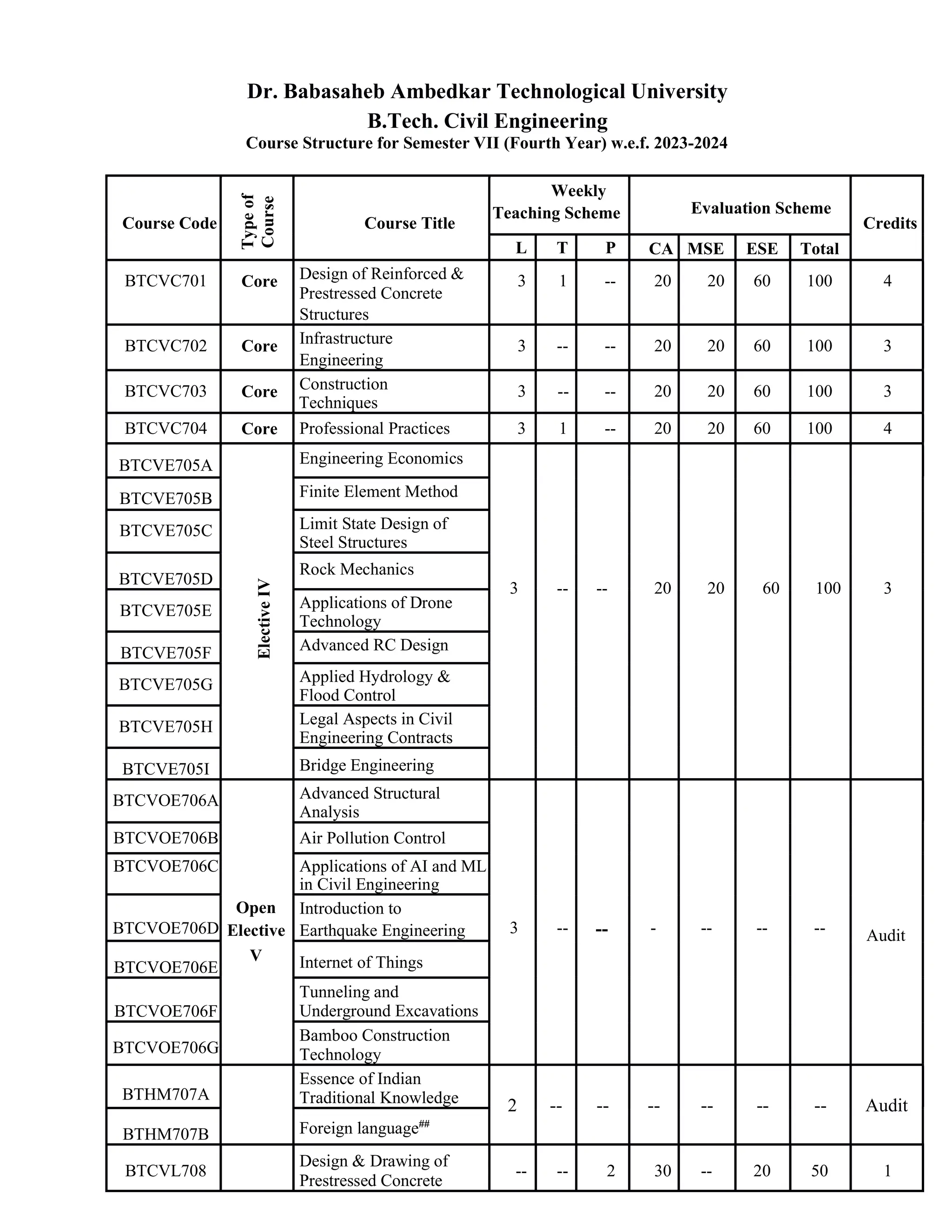 The document outlines the curriculum for the B.Tech in Civil Engineering at Dr. Babasaheb Ambedkar Technological University, covering the course structure for the fourth year starting from the academic year 2023-24. It details the core and elective subjects, weekly teaching hours, evaluation schemes, and course outcomes across two semesters. Additional information includes self-study courses, internship requirements, and various engineering topics related to civil engineering education.