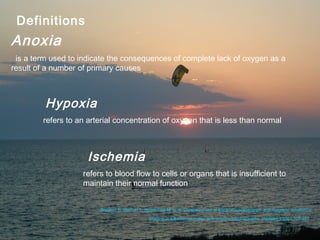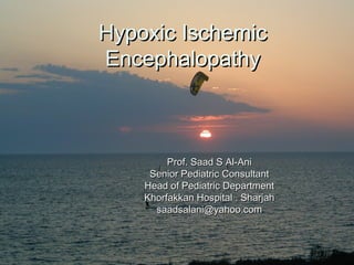 This document discusses hypoxic ischemic encephalopathy (HIE), which is brain damage caused by a lack of oxygen and blood flow around the time of birth. It defines related terms like anoxia and hypoxia. It describes the effects of HIE on different body systems. It outlines the stages of HIE based on clinical signs. It discusses causes of fetal and newborn hypoxia, pathophysiology, treatment involving supportive care and seizure management, and prognosis which depends on factors like gestational age and severity of encephalopathy. Between 15-30% of infants with HIE die or are left with permanent neurological impairments.