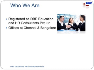 DBE Education & HR Consultants Pvt Ltd is a recruitment and HR consulting firm registered in Chennai and Bangalore, India. The management team has over 70 years of combined industry experience across various sectors. In the 2011-2012 financial year, the firm closed 145 job positions for clients in roles ranging from junior to senior levels. DBE focuses on quality, customer satisfaction, and leveraging modern recruitment technologies like LinkedIn and Facebook.