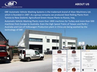 DBF Automatic Vehicle Washing Systems, a trademark of Alser Machinery Ltd. founded in 1987, specializes in producing a variety of automatic car, bus, and train washing systems. Their extensive product range includes models for different vehicle types, designed to meet diverse washing needs, including specialized machines for military and uniquely shaped vehicles. With over 1800 machines installed in Turkey and more than 500 across Europe and Australia, DBF's technology is also utilized for high-speed trains and production vehicles.