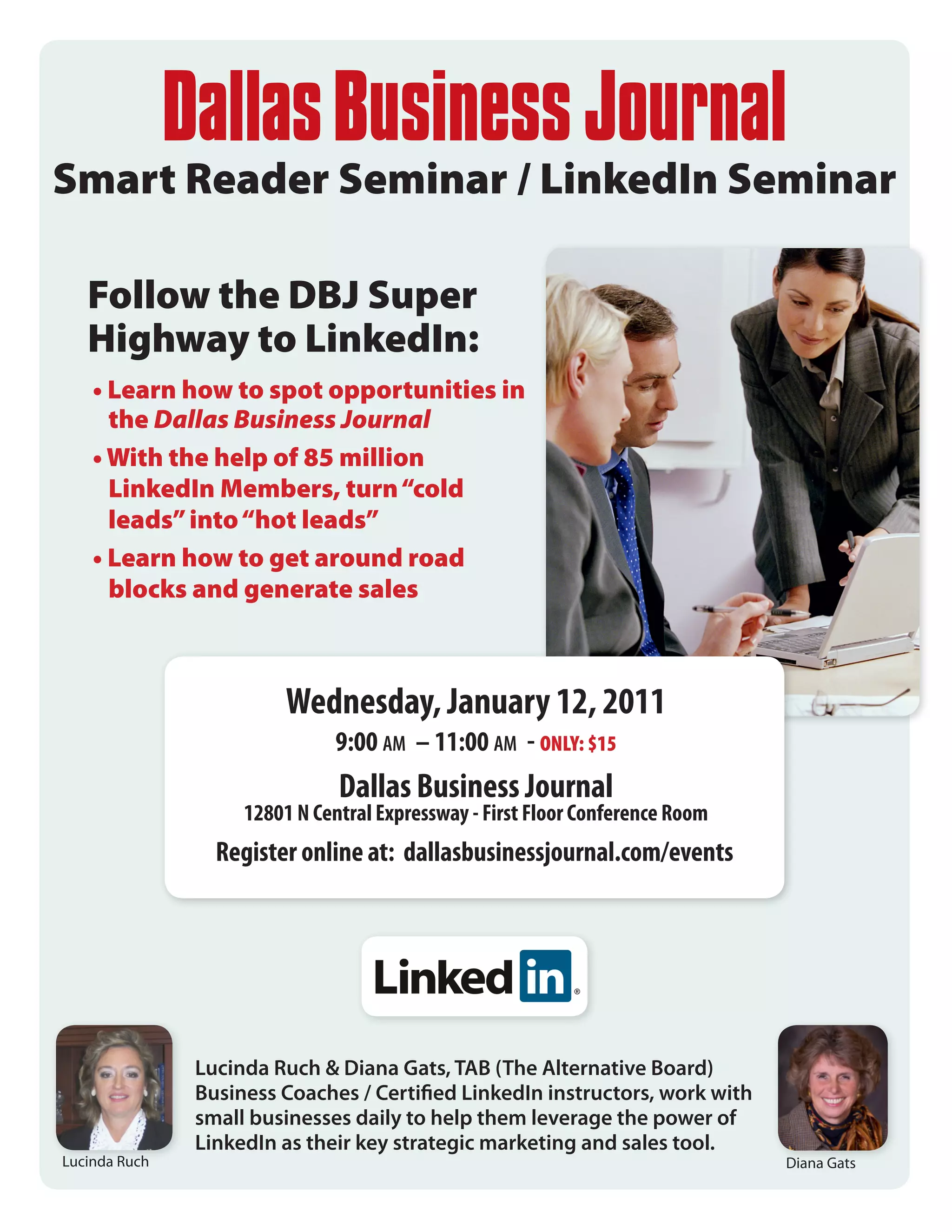 The document outlines a seminar hosted by the Dallas Business Journal on January 12, 2011, focused on leveraging LinkedIn to enhance business opportunities. Participants will learn how to identify opportunities, convert leads, and overcome sales barriers for a fee of $15. The seminar will be conducted by certified LinkedIn instructors who specialize in helping small businesses.