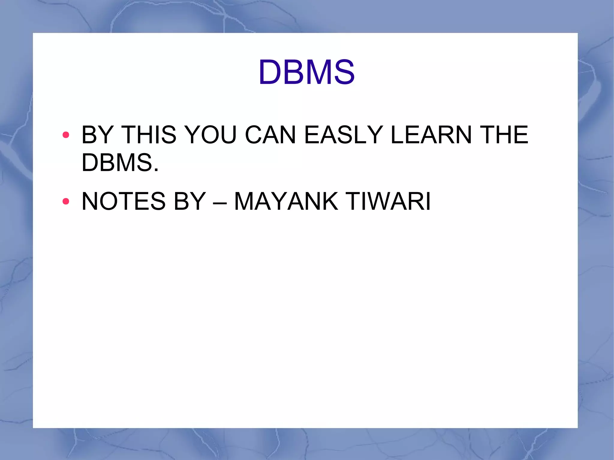 This document provides an overview of database management systems (DBMS). It defines a DBMS as software that manages data and allows for data to be accessed by multiple users and applications. The document then covers the introduction, properties, benefits, types, entity relationship diagrams, and differences between DBMS and relational DBMS. It provides examples and definitions for each topic.