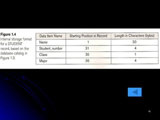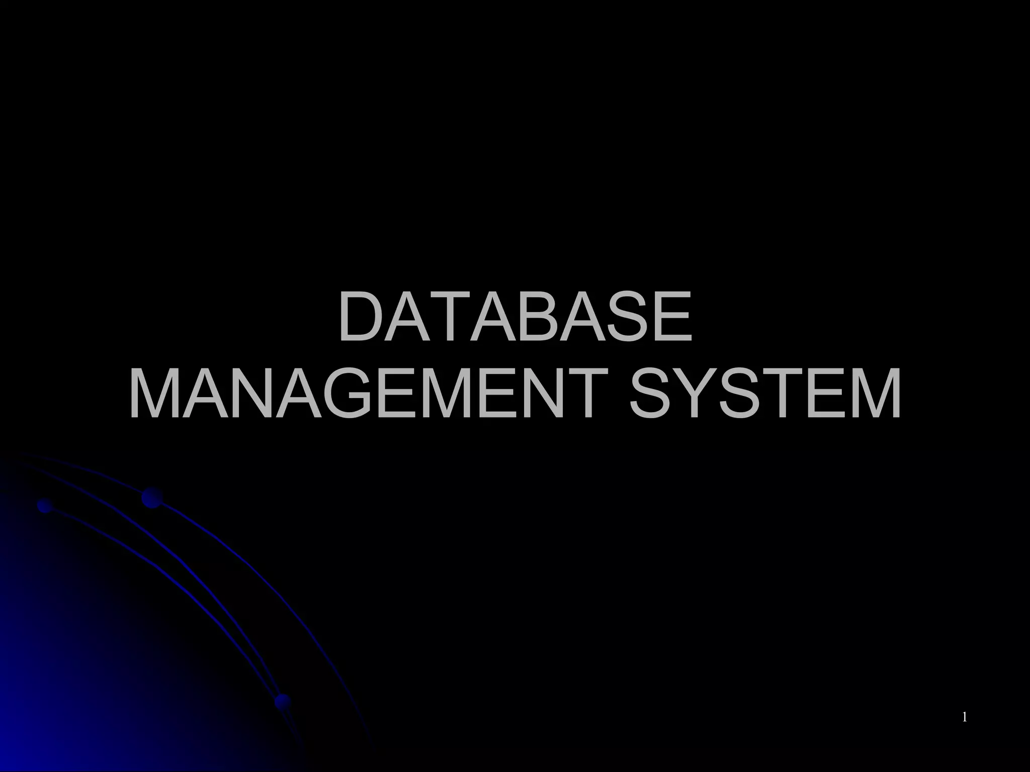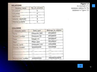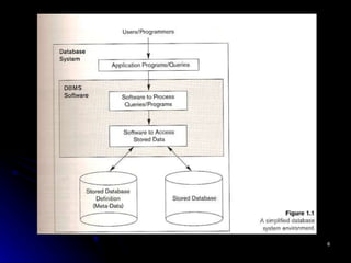 The document discusses database management systems (DBMS). It defines a database as a collection of related data and describes a DBMS as software that enables users to create, maintain and share databases. It provides an example of a university database with files for students, courses, grades and prerequisites. It outlines key characteristics of the database approach such as self-describing nature, insulation between programs and data, support of multiple views, and sharing of data.