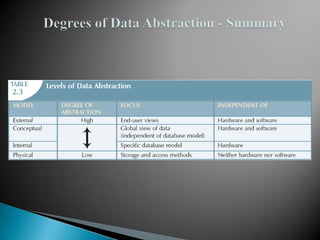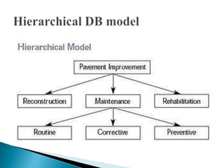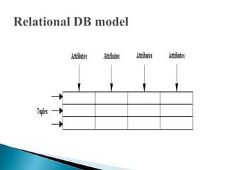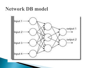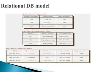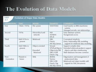 The document discusses database management systems and data modeling. It begins by defining key terms like data, databases, database management systems, and data models. It then provides a brief history of database development from the 1960s to the 1980s. The rest of the document discusses database concepts in more detail, including components of a DBMS, types of database users, database administration responsibilities, data modeling techniques, and the evolution of different data models.