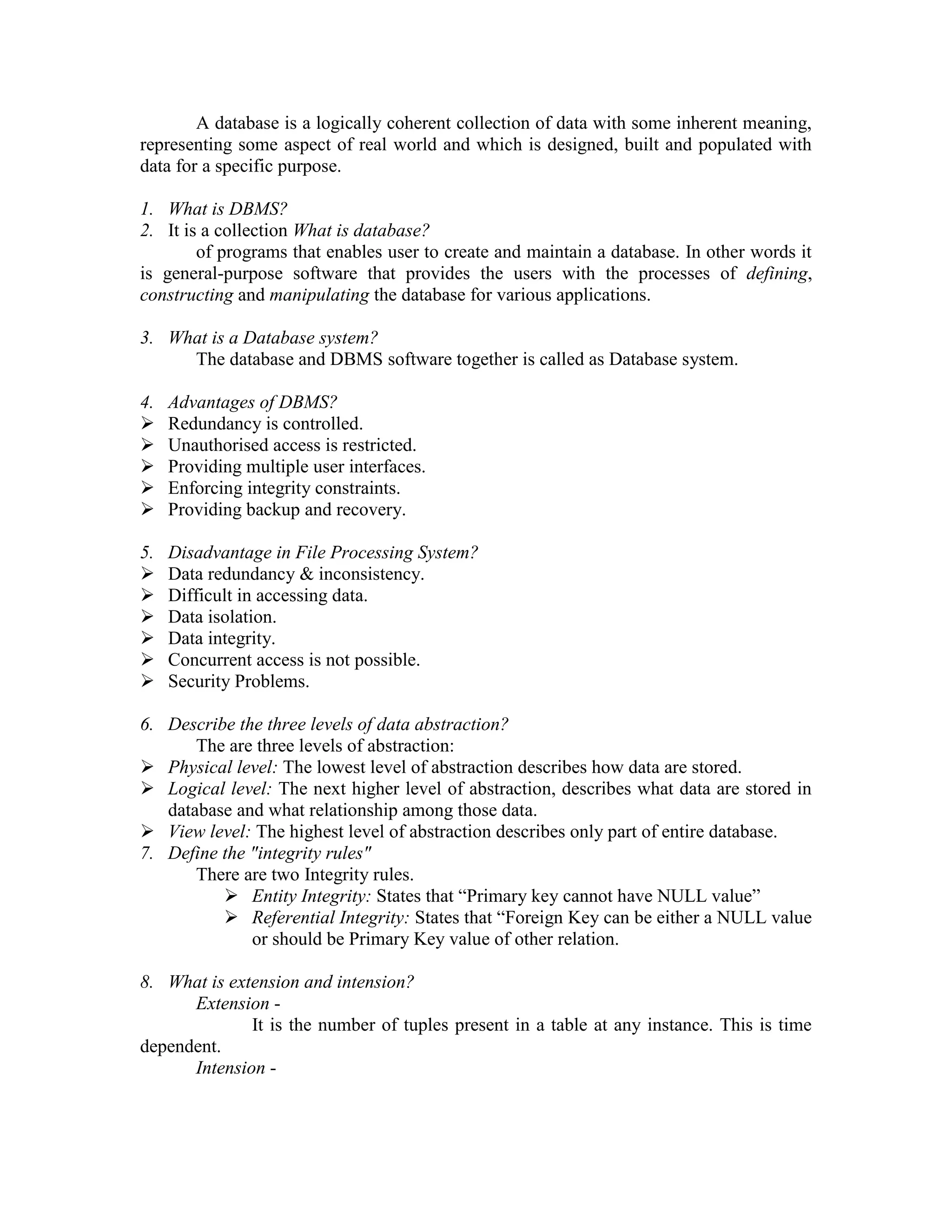 A database is a collection of logically related data organized for convenient access, usually by programs for specific purposes. A DBMS is software that allows users to define, construct and manipulate databases for various applications. The database and DBMS together form a database system. A DBMS provides advantages like reducing data redundancy and inconsistency, restricting unauthorized access, and enforcing data integrity and security.