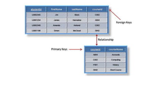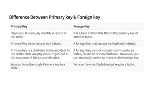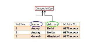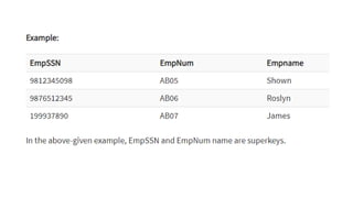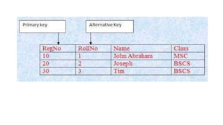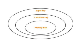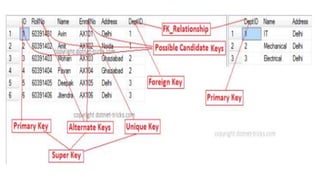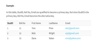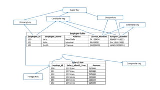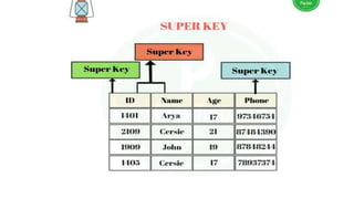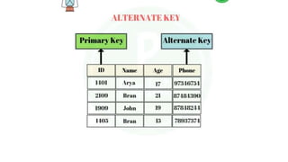 The document discusses different types of keys used in database management systems. It defines primary keys as columns that uniquely identify rows in a table and cannot contain null values. It also describes candidate keys, super keys, foreign keys, alternate keys, composite keys, and surrogate keys. The key types allow tables to be linked together and ensure uniqueness and integrity of data in the tables.
