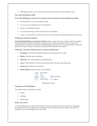 ER diagrams are used to visually represent the logical structure of databases and the relationships between entities stored in a database. The key components of an ER diagram include entities represented by rectangles, attributes represented by ovals, and relationships represented by diamonds. ER diagrams help identify the entities, attributes, relationships, and cardinalities that should exist in a database design. Creating an ER diagram is an important first step before implementing a relational database.