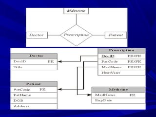 An entity relationship diagram (ERD) is a graphical representation of an organization's data storage requirements. ERDs identify the data that must be captured and stored to support business activities and performance measures. They have three main components - entities, attributes, and relationships. Entities represent people, places, things, and concepts of interest. Attributes are properties of entities. Relationships define associations between entity types. Together these components provide a model of an organization's data.