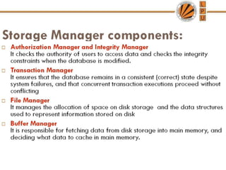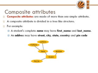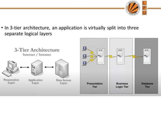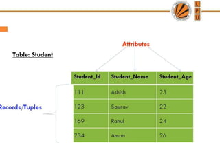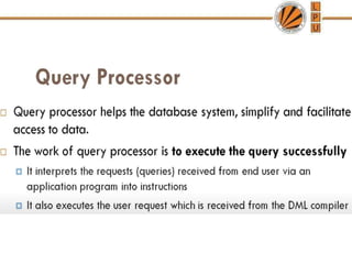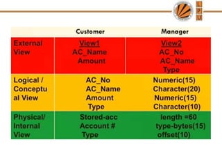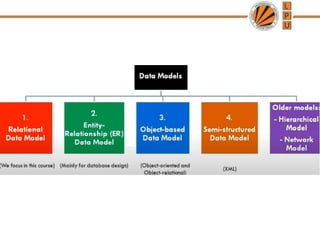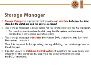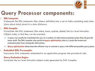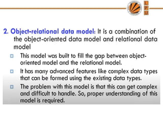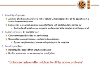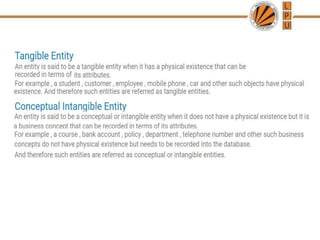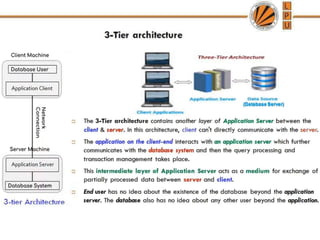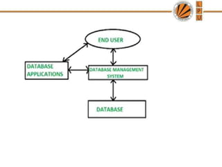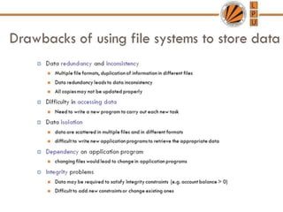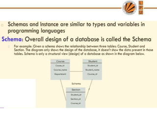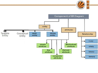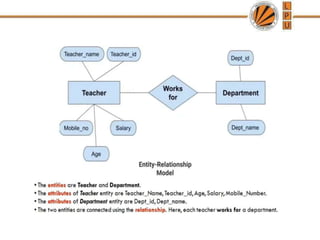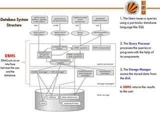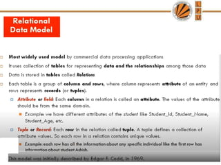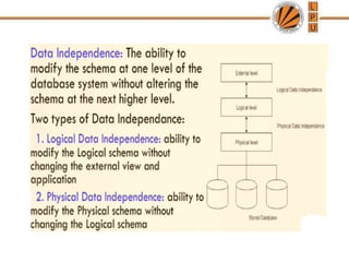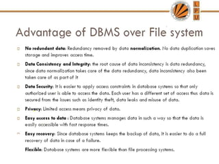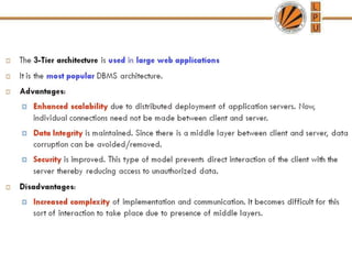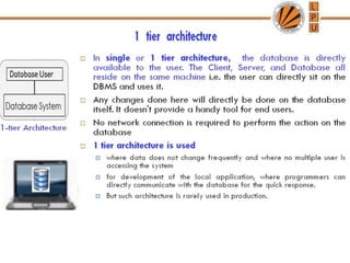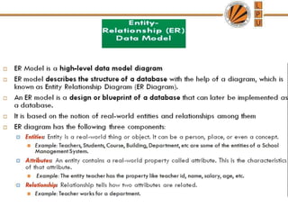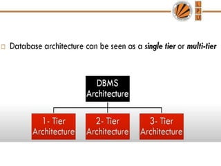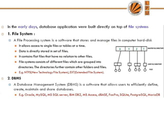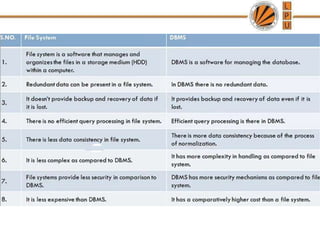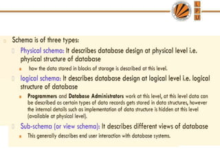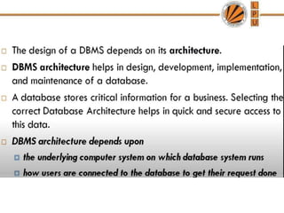 This document provides an overview of database management systems (DBMS) and their basic concepts. It discusses the differences between data and information, the components of a database including hardware, software, data, users and procedures. It also describes database operations, data models, database architecture including three-tier architecture, database languages, data modeling using entity-relationship diagrams, and constraints in ER modeling including mapping cardinalities, participation constraints, and keys.