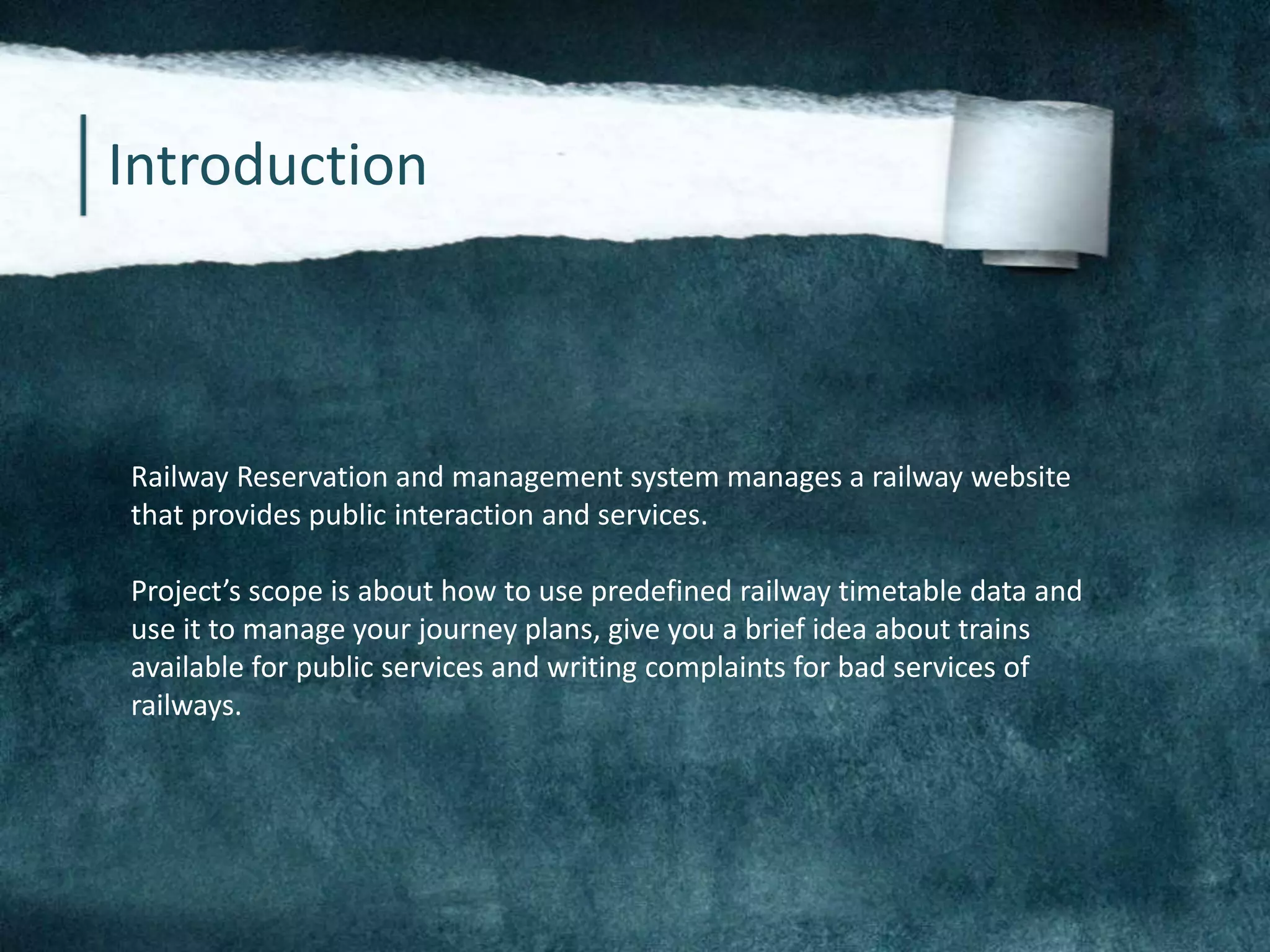 The document describes a railway reservation and management system project. The system will manage a website that allows public interaction and services like train inquiries, seat availability checks, ticket booking and cancellations, and complaints. It will use a database of train timings and fares to calculate journey plans, expenses, and more. The system architecture includes backend databases modeling train, station, and user data and their relationships, an application program to perform calculations, and a frontend website for reservations and other functions.
