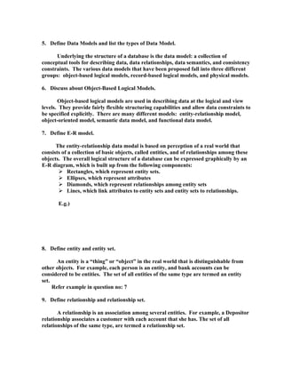 The document provides definitions and explanations of key concepts in database management systems. It discusses: