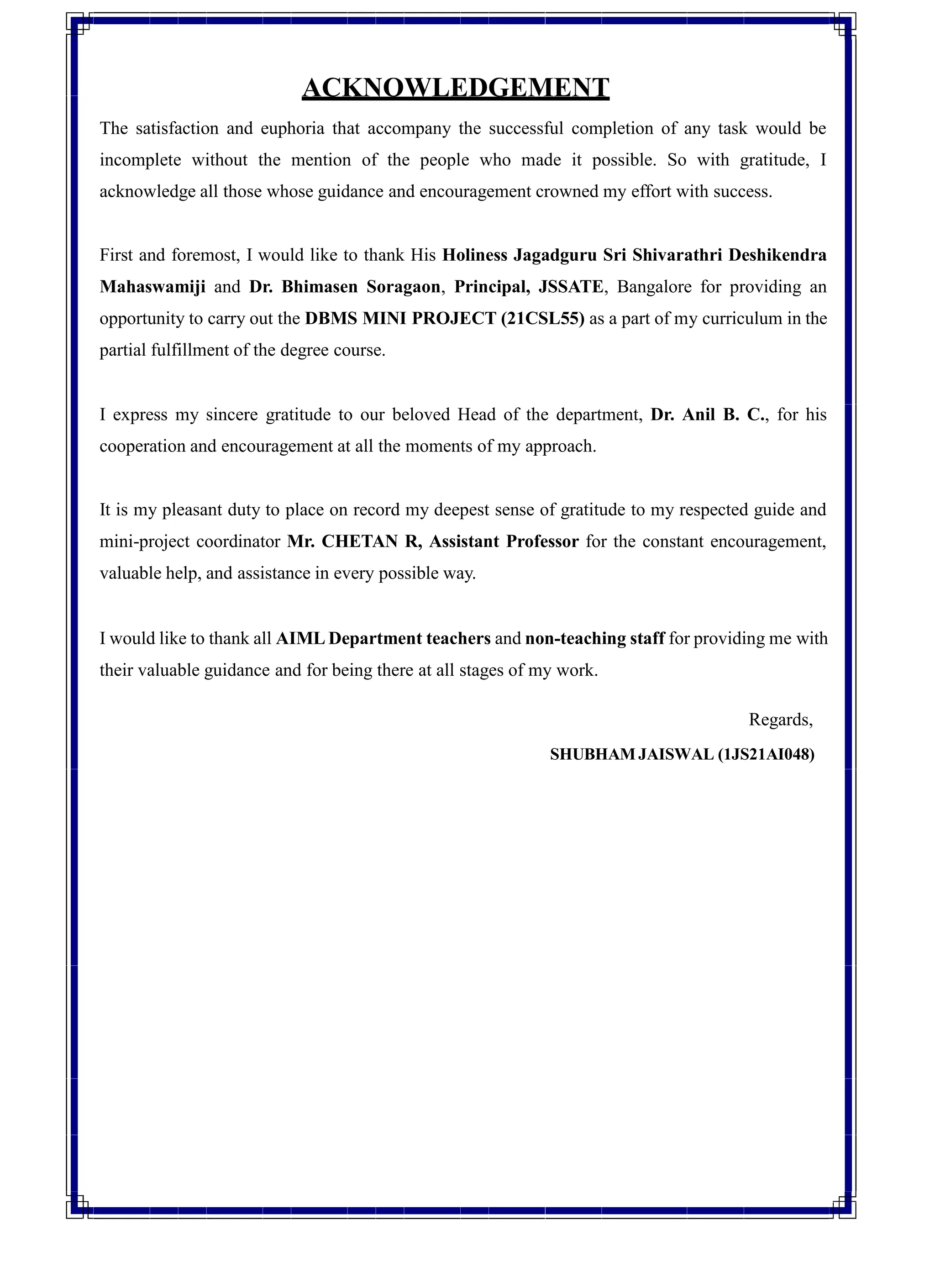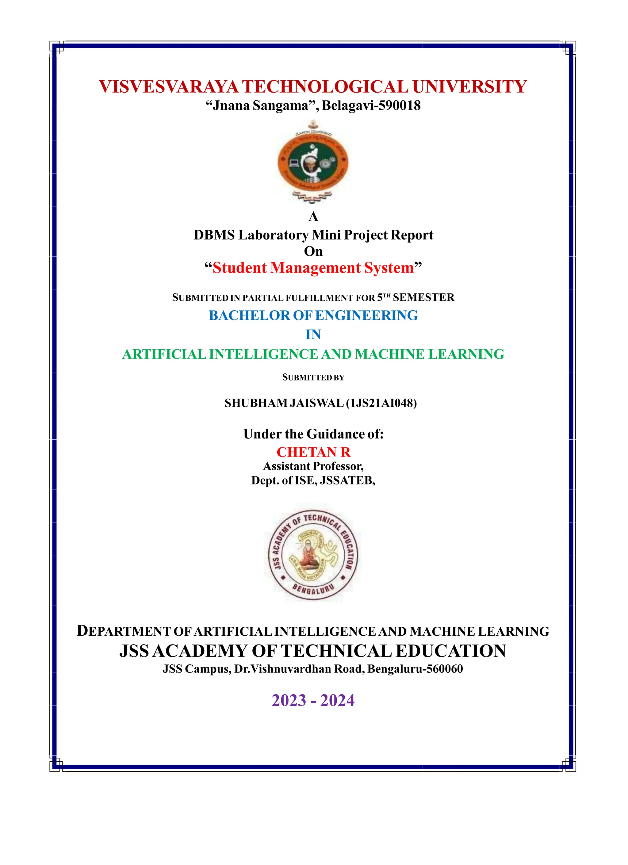 The document is a mini project report on a 'Student Management System' developed by Shubham Jaiswal as part of his coursework at JSS Academy of Technical Education, Bengaluru. It outlines the project's purpose to automate and streamline student management processes, emphasizing efficiency and collaboration among educational stakeholders. The report includes chapters on system analysis, design, implementation, and testing, detailing the functionalities and technologies employed in building the system.