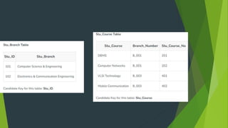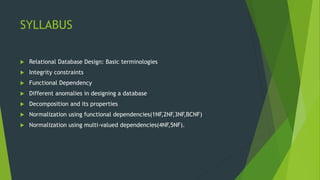 - The processes of decomposition, which breaks tables into smaller relations, and normalization, which reduces data redundancy through forms like 1NF, 2NF, 3NF, BCNF, and handling multi-valued dependencies in 4NF and 5NF.