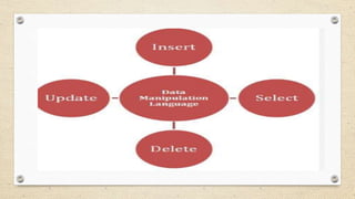 This document provides an overview of DBMS (Database Management Systems) and related concepts. It discusses relational algebra operations like select, project, union, set difference, cartesian product, and rename. It also covers SQL components like data types, data definition language, data manipulation language, and data control language. Key concepts around query language, relational algebra characteristics and operations, and SQL characteristics, syntax rules, and data types are summarized. Set operations like union, intersect, and except in MySQL are also outlined.