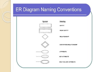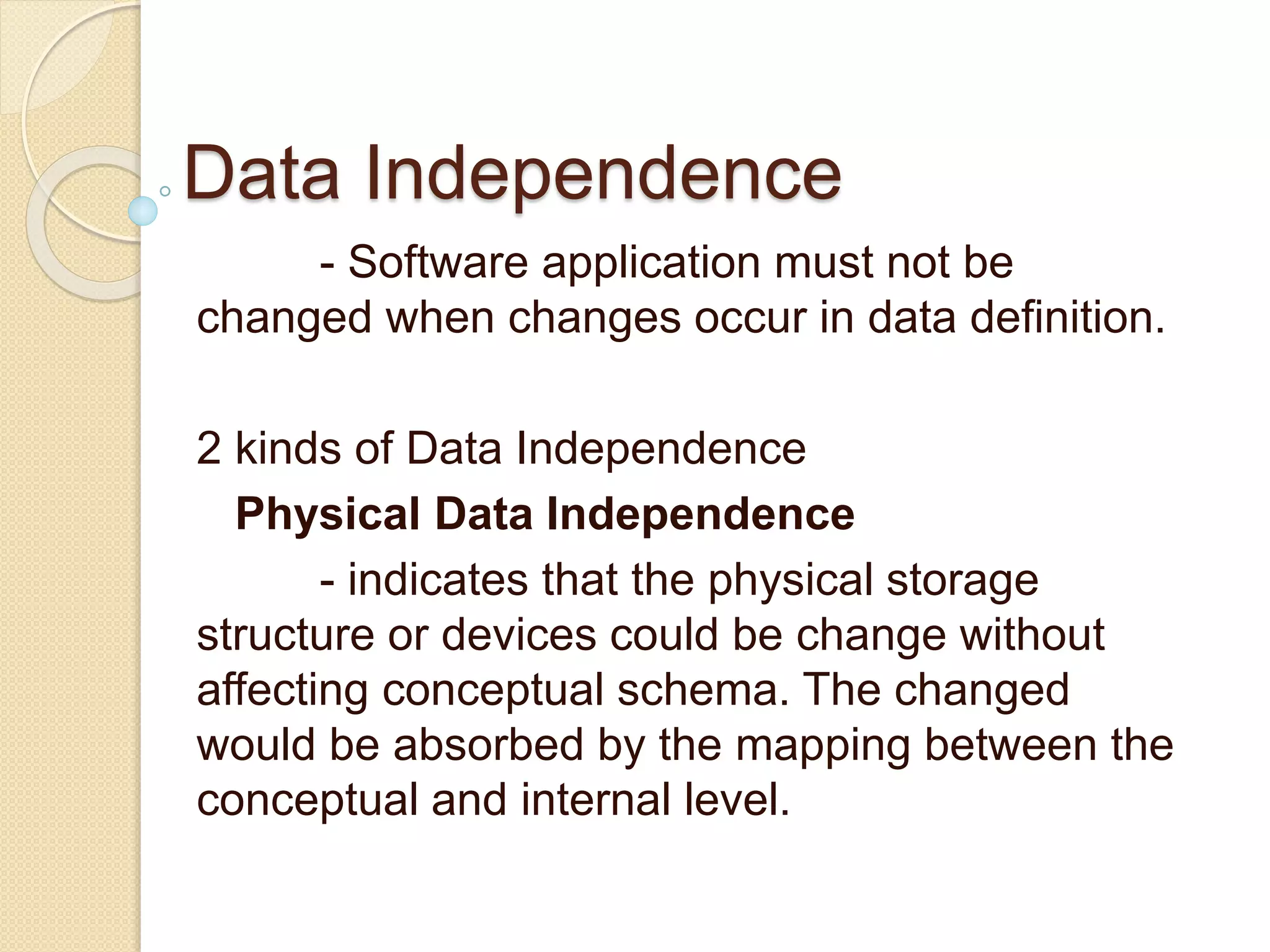 Data independence refers to the ability to modify either the conceptual or internal schema without requiring changes to the other. There are two types of data independence: physical data independence, which allows changes to the physical storage structure without affecting the conceptual schema, and logical data independence, which allows changes to the conceptual schema without affecting external schemas. An entity-relationship model uses entities, attributes, and relationships to graphically represent how data is organized within a database. Entities can have simple, composite, derived, single-value, or multi-value attributes, and keys uniquely identify entities within an entity set.