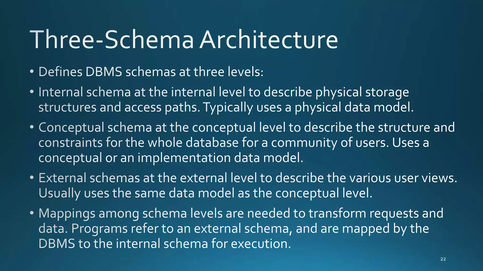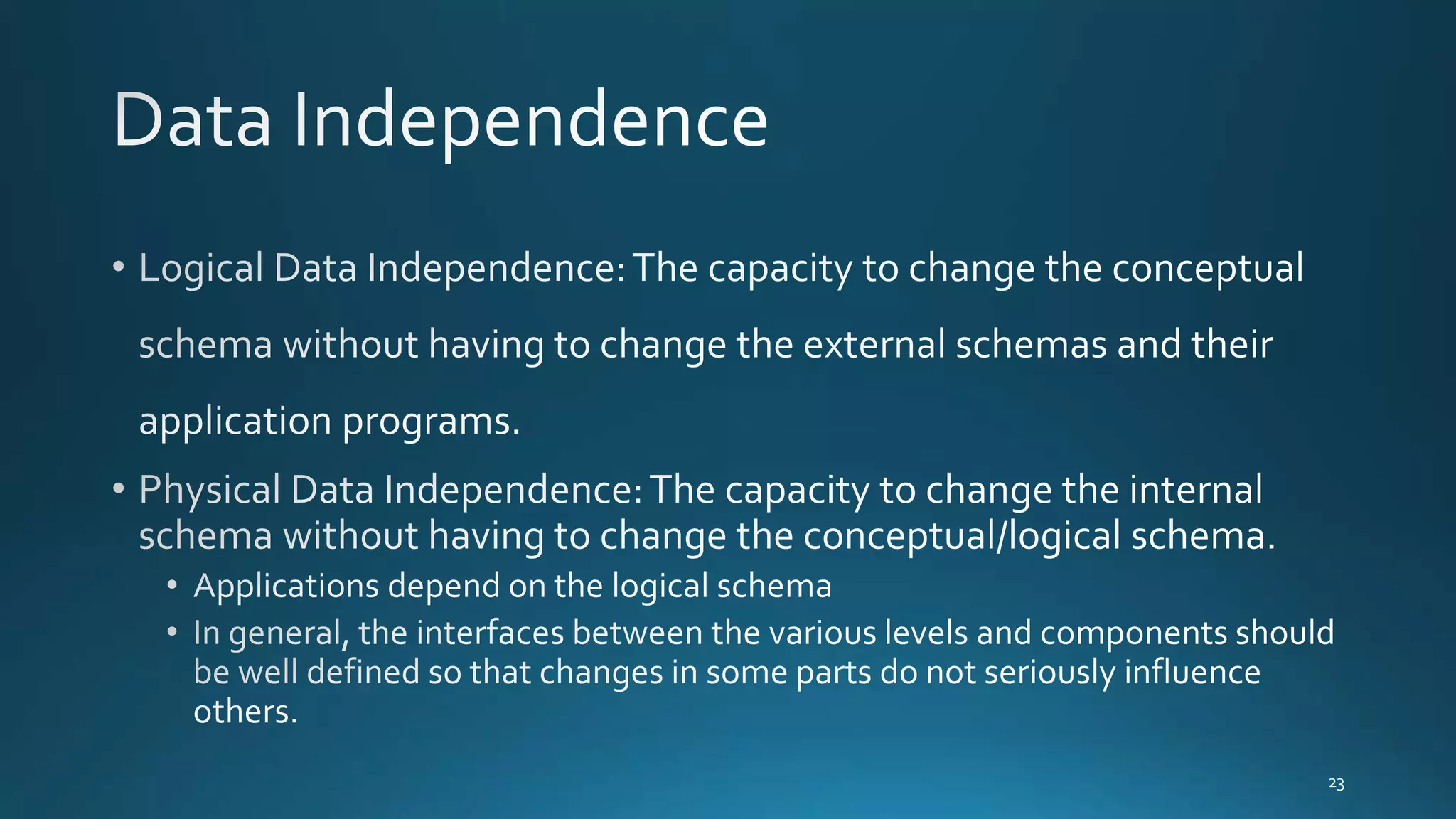 A Database Management System (DBMS) supports data independence by allowing changes to lower-level schemas without affecting higher-level schemas or application programs. When a lower-level schema changes, only the mappings between it and higher schemas need updating. Higher schemas remain unchanged, so applications referring to external schemas do not require modification.