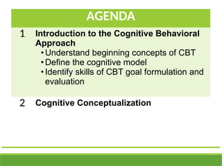 The document outlines the Cognitive Behavioral Therapy (CBT) model, focusing on its principles and goals, particularly the relationship between thoughts, emotions, and behaviors. It discusses the cognitive model and automatic thoughts, emphasizing that recognizing and modifying dysfunctional thinking can lead to emotional and behavioral improvements. It also includes practical exercises for identifying and evaluating automatic thoughts to aid in symptom alleviation.