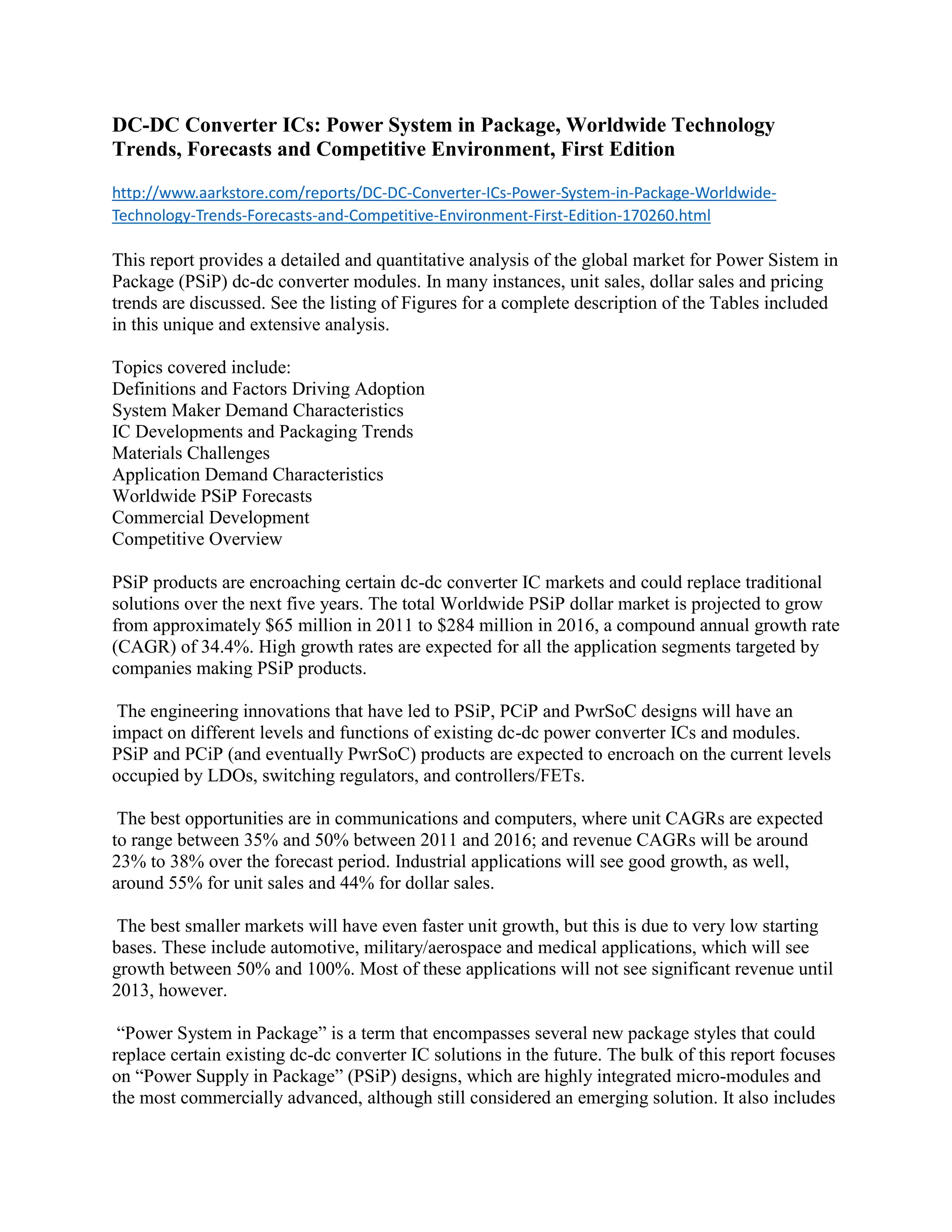 This report analyzes the global market for Power System in Package (PSiP) dc-dc converter modules. It forecasts strong growth in the PSiP market from $65 million in 2011 to $284 million in 2016 due to factors like increasing demand from communications and computers. PSiP devices could replace solutions like voltage regulators and switching converters by offering higher efficiency and power density. The report also examines technology trends, competitive landscape, and market opportunities for PSiP products in various applications.